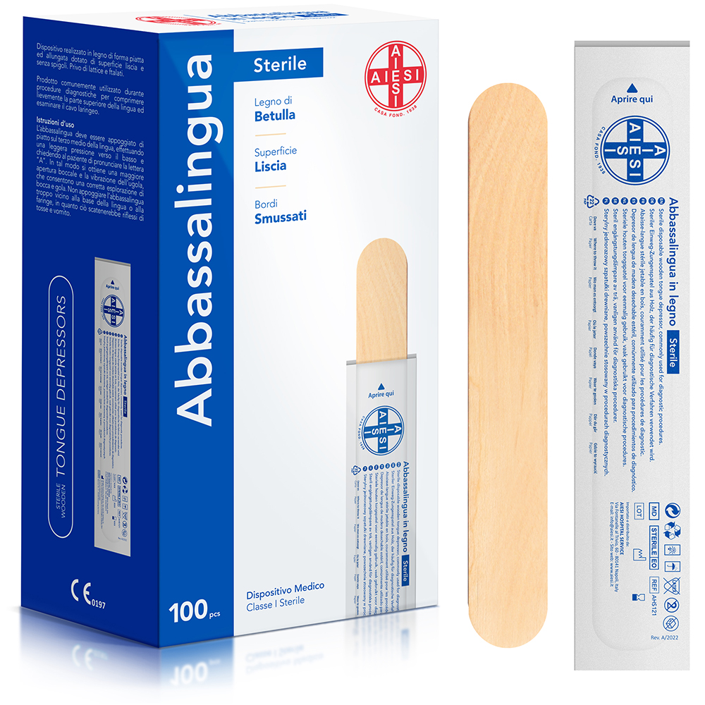Dispositivo realizzato in legno di forma piatta ed allungata dotato di superficie liscia e senza spigoli. Prodotto privo di lattice e ftalati.